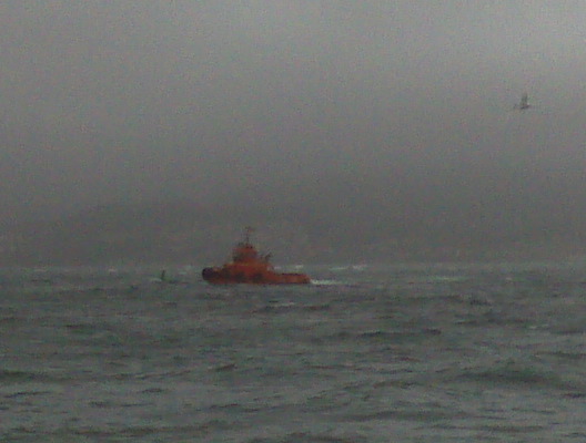 El barco se parece mucho a los de salvamento marítimo, no sé si será uno de ellos. La niebla, gallega y el mar, una de las rias.